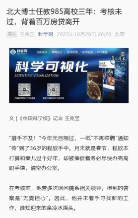 今年元旦刚过,一纸“不再续聘”的通知,让36岁的程欣措手不及。作为北大的优秀博士毕业生,他曾手握33个offer,最终选择了一所985高校,期待在学术道路上深耕。但三年后,非但未能通过考核,还背负上百万房贷,最终不得不举家南迁,另谋出路。
